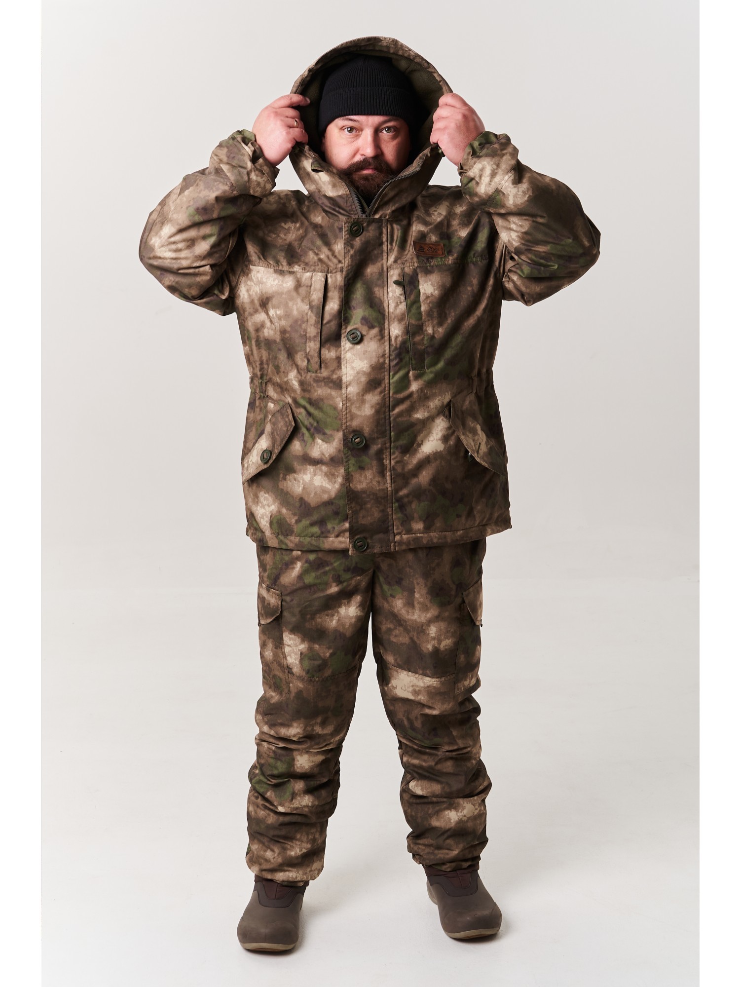 для охоты и рыбалки, а также для активного отдыха, туризма и похода в лес. Куртка удлиненная застегивается на молнию и имеет ветрозащитную планку с пуговицами. Капюшон несъёмный, шлемообразый, с козырьком, регулируется по объему и по овалу лица. 5 карманов на куртке: 2 прорезных на пуговицах, 2 накладных на рукавах на липучке, 1 нагрудный карман для документов на молнии. Боковые утяжки для изменения объема на талии. Брюки имеют подтяжки с отстегивающейся спинкой. Пояс брюк эластичный дополнен шлевками для ремня, гульфик застегивается на молнию и пуговицы, два кармана у пояса, два объемных кармана на бедрах на липучках. Подколенная область собрана на кулиску с резинкой, по низу брюк эластичные манжеты.